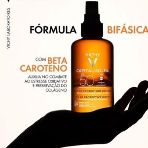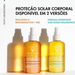 Protetor solar corporal iluminador. Vichy Capital Soleil FPS50 protege a pele dos raios solares, enquanto prolonga o bronzeamento.