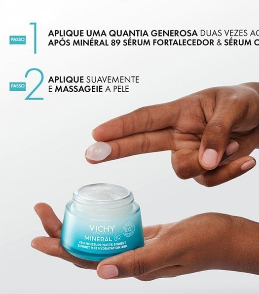 Gel hidratante facial. Vichy Minéral 89 Sorbet Mat Hydratation 48h garante uma sensação única de frescor e bem-estar.